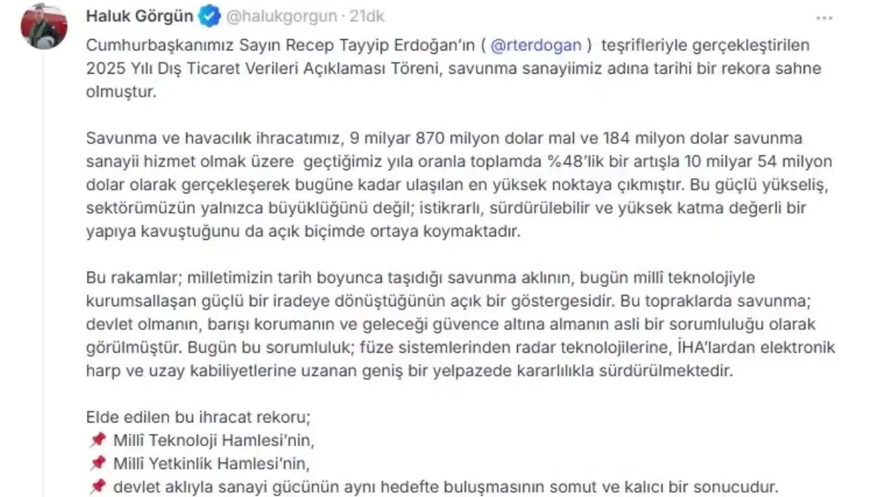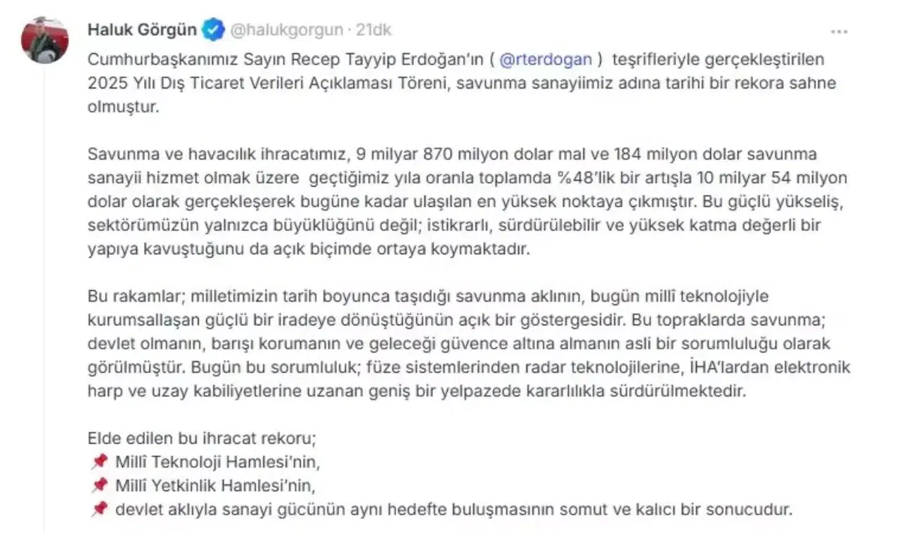 Görgün, 2025 yılı dış ticaret verilerini sosyal medya hesabından paylaştı ve Cumhurbaşkanı Recep Tayyip Erdoğan’ın katılımıyla gerçekleştirilen 2025 Yılı Dış Ticaret Verileri Açıklaması Töreni’nin savunma sanayii açısından tarihi bir rekora tanıklık ettiğini belirtti. İhracat rakamları arasında 9 milyar 870 milyon dolarlık mal ihracatı ve 184 milyon dolarlık savunma sanayi hizmeti yer aldı. Bu veriler, Türkiye’nin savunma sanayi alanındaki güçlü yükselişini gözler önüne seriyor.