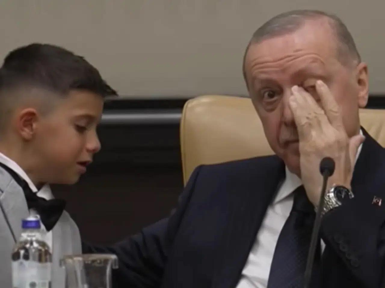 23 Nisan etkinlikleri kapsamında Cumhurbaşkanlığı Külliyesi’nde çocukları ağırlayan Erdoğan, minik misafirlerinin şiirleriyle duygulandı. Hayalini kurduğu buluşmada gözyaşlarını tutamayan Mutlucan Korkmaz, Cumhurbaşkanı Erdoğan’ın teselli dolu sözleriyle sakinleşti.