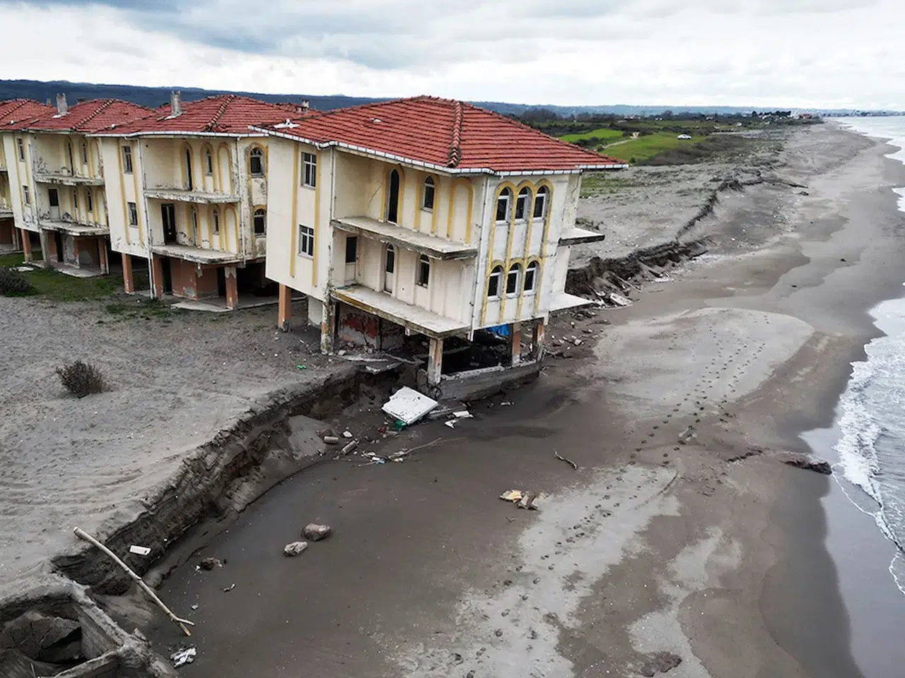 Sakarya’nın Karasu ilçesinde kıyı erozyonu nedeniyle devasa bir tatil köyü sular altında kalma riskiyle karşı karşıya; 100 metre ilerleyen deniz, lüks villaları harabeye çevirdi.
