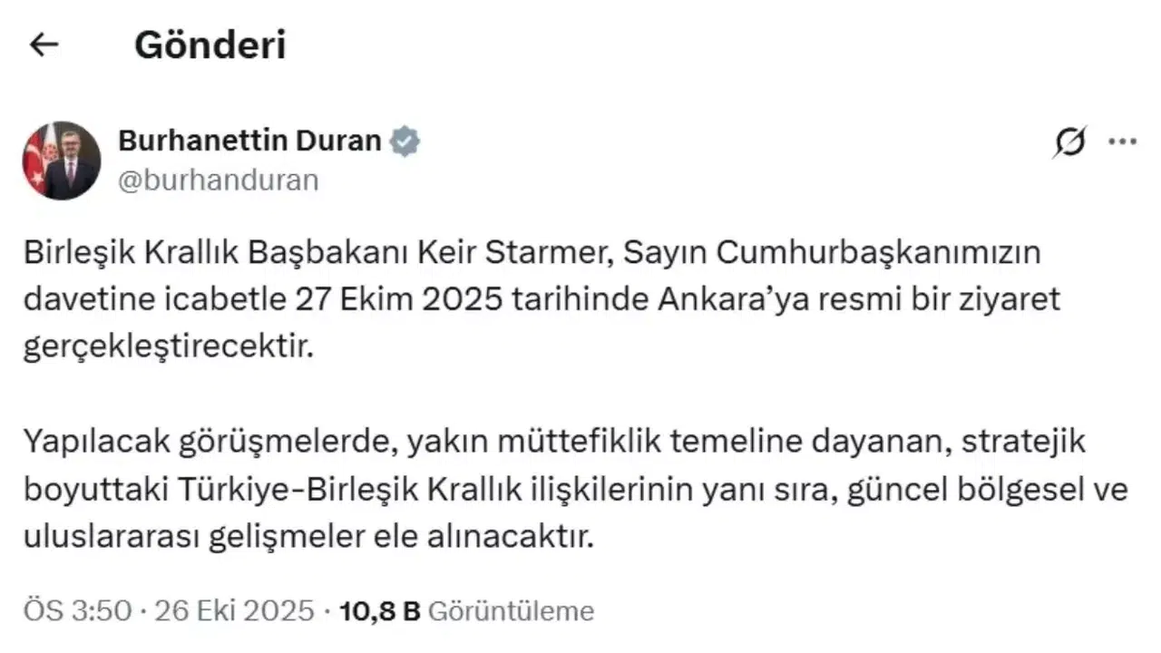 İletişim Başkanı Burhanettin Duran, sosyal medya üzerinden yaptığı açıklamada, Starmer'ın ziyaretinin Türkiye ile Birleşik Krallık arasındaki stratejik ortaklığı pekiştirmek amacı taşıdığını belirtti. Duran, bu görüşmelerde iki ülkenin müttefiklik ilişkilerine dayanan iş birliğinin yanı sıra, güncel bölgesel ve uluslararası gelişmelerin de ele alınacağını ifade etti. Bu bağlamda, savunma, ticaret ve iklim değişikliği gibi konular üzerinde durulması planlanıyor.