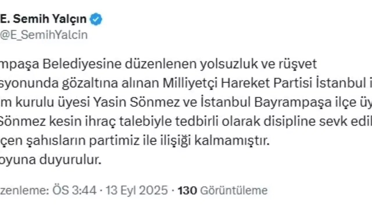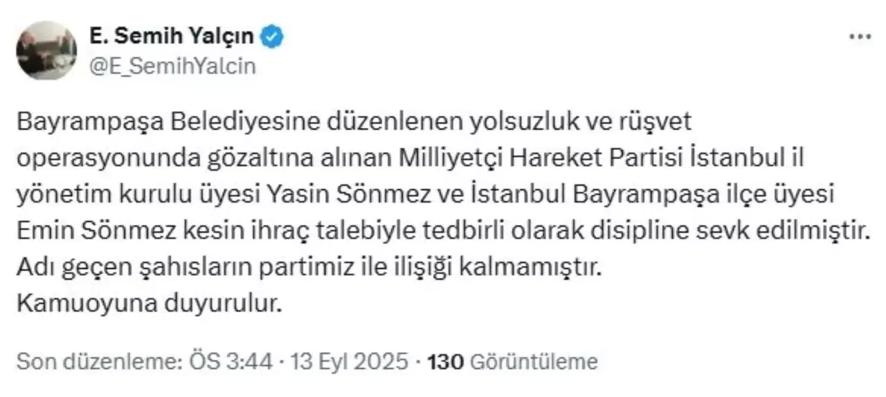 MHP Genel Başkan Yardımcısı Semih Yalçın, sosyal medya üzerinden yaptığı açıklamada, yolsuzluk ve rüşvet soruşturması kapsamında gözaltına alınan bazı partili isimlerin partileriyle olan bağlantılarının kesildiğini duyurdu. Bu açıklama, kamuoyunda dikkat çeken bir gelişme olarak öne çıktı.